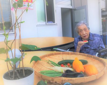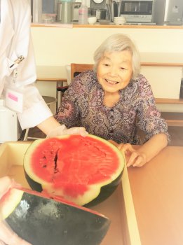 今日は利用者様の目の前で、でんすけすいかを提供させて頂きました。